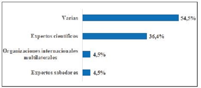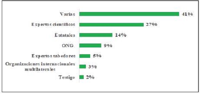 Tipo de fuentes según su origen organizacional En estos resultados se hizo una primera clasificación general de las fuentes utilizadas en las publicaciones según su origen organizacional. Así, se identificaron los siguientes siete tipos: 1) estatales, referidas a instituciones de un Estado-nación; 2) organizaciones internacionales multilaterales, para instituciones que congregan tres o más estados nación; 3) ONG, para fundaciones, asociaciones reconocidas como organizaciones no gubernamentales; 4) expertos científicos, que incluyen centros de estudios o investigación, sus productos y resultados en informes, así como a investigadores y académicos especialistas en temas ambientales; 5) expertos sabedores, para identificar a activistas y líderes en temas ambientales reconocidos por su saber ancestral, popular, cultural o fuentes documentales de organizaciones sociales reconocidas por su activismo ambiental y que no están catalogadas como ONG; 6) testigos, para identificar a ciudadanos del común que narran o dan su punto de vista a título personal sobre alguna situación y no representan ninguna institución; 7) empresariales, referidas al sector privado de producción, empresas y gremios sectoriales; y 8) medios, es decir, otros medios de comunicación y agencias de noticias.