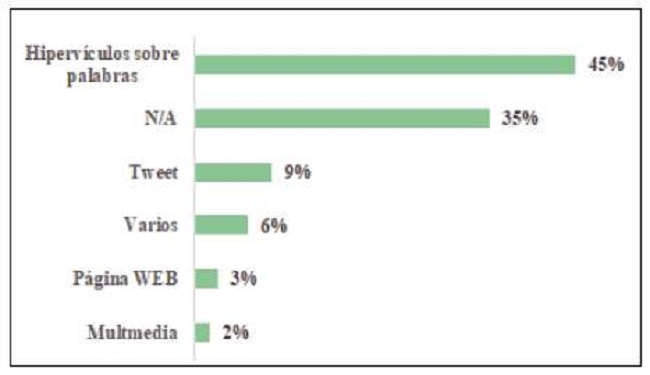 El uso de destacados, es decir, textos que se resaltan en el mismo cuerpo o que se repiten a manera de énfasis en apartados específicos con características tipográficas distintas, es bajo en El Espectador. En promedio las publicaciones tienen 4 destacados; el 32 % de las publicaciones no usa este recurso; el 36 % usa menos de cinco destacados; el 14 % tiene entre 6 y 10 destacados, y el 18 % utiliza más de 10 destacados por publicación. En cuanto a los enlaces/referencias (gráfico 3), un 63,6 % de las publicaciones no utiliza ningún tipo de enlace/referencia; el 31,8 % de las notas publicadas utilizan enlaces que remiten a páginas web a través de hipervínculos sobre palabras, y especialmente para remitir a las fuentes utilizadas en el desarrollo de la información; se trata en general de enlaces hacia páginas web de organizaciones sociales, instituciones de investigación y revistas científicas especializadas, y el 4,5 % utiliza vínculos a fotos, videos o declaraciones en cuentas de Twitter.