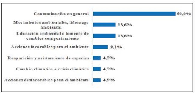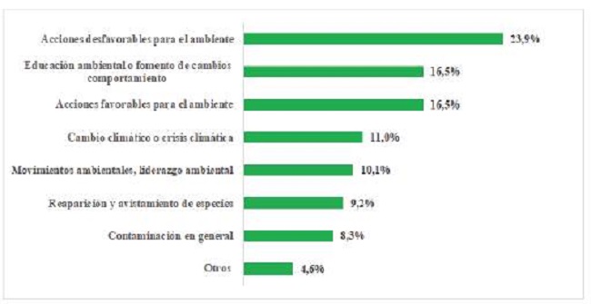 Esta categoría se construyó a partir de resultados emergentes en una primera caracterización de los titulares y subtítulos del total de materiales recopilados. Las temáticas encontradas fueron: 1) contaminación en general (denominada así al comprender los temas relacionados con información sobre los diferentes tipos de emanaciones perjudiciales para el medioambiente y las variaciones del mismo tema); 2) el cambio climático o crisis climática (con referencia a las variaciones en la temperatura del planeta por emisiones de gases de efecto invernadero o consecuencias generalizadas de los factores climáticos); 3) los movimientos ambientales y el liderazgo ambiental (en alusión a los llamados relativos a situaciones ambientales proferidos por sujetos u organizaciones notables); 4) educación ambiental o fomento de cambios de comportamiento favorables para el ambiente (temática con un enfoque en la formación, para que los seres humanos asuman nuevos hábitos y así actúen coherentemente con la preservación del ambiente); 5) reaparición y avistamiento de especies (sobre animales silvestres vistos en lugares no habituales); 6) acciones favorables para el ambiente (incluye las referencias a comportamientos con efectos positivos para el ambiente), y también su opuesto 7) acciones desfavorables para el ambiente (los comportamientos con efectos negativos). Finalmente, 8) otras temáticas fuera de las listadas anteriormente, con información a veces inexplicablemente ubicada en la sección sobre medio ambiente.