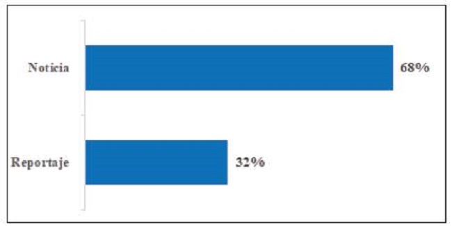 En el gráfico 9 es evidente la escasa variedad de géneros utilizados en El Espectador: de las siete opciones posibles, se encontraron únicamente dos: la noticia, que predomina en el 68 % de las publicaciones; seguida por el reportaje, que permite mayor profundidad tanto de enfoque de los temas como de fuentes.
