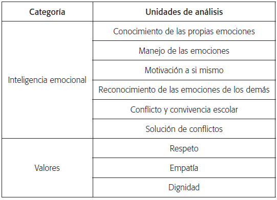 Respecto al análisis de la información e interpretación de resultados, se utilizó una matriz de categorización axial en la que se sistematizó las dos categorías con sus respectivas unidades de análisis: a) Conocimiento de las propias emociones, Manejo de las emociones, Motivación a sí mismo, Reconocimiento de las emociones de los demás y Solución de conflictos, para la categoría 1- Inteligencia emocional, y b) Respeto y Empatía y dignidad, para la categoría 2 - Valores, tal y como se describe en la tabla 1.