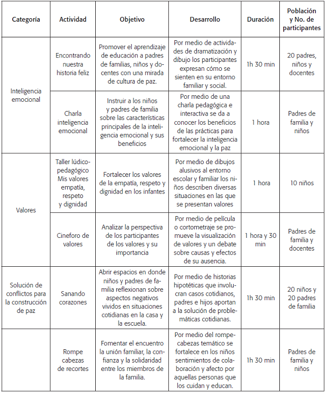 La inteligencia emocional, conjuntamente con los valores, influye de manera significativa en el aprendizaje y comportamiento de los niños en la primera infancia, permite fortalecer sus creencias frente a cómo identificar, entender y resolver los conflictos. Por consiguiente, al añadir la temática de la paz territorial desde la construcción de paz como una estrategia didáctica en las entidades educativas y de salud, se ofrece un aporte significativo a la percepción social sobre la coexistencia pacífica y frente al amplio proceso que significa hablar, enseñar y practicar la paz.