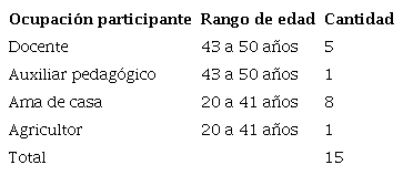 La población participante correspondió a docentes, padres de familia y niños del área rural del municipio de Chitagá pertenecientes al programa "De cero a siempre". Para definir la muestra se implementó el muestreo no probabilístico por bola de nieve (Hernández Sampieri et al., 2014), lo que permitió la selección de quince personas (doce de género femenino y tres de género masculino), habitantes de la cabecera municipal y de las veredas El Alizal y Chucarima, ubicadas al norte y sur occidente del municipio, respectivamente, cuya población se dedica principalmente a la agricultura, ganadería y minería. Las características generales de los participantes se describen en la tabla 2.