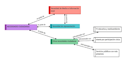 En la figura 2 se muestra cómo se relacionan ciertas necesidades expresadas en los grupos focales. Hubo opiniones y requerimientos sobre educación en medio ambiente, contaminación y minería, demandas por mayor vinculación con el sector público gubernamental y el interés por lograr mayor interrelación con agrupaciones sociales locales. También se incluye lo digital, mejor televisión desde lo técnico (tanto en la local como en la nacional).