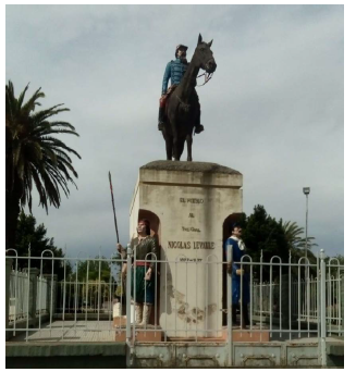 En el caso de Carhué podemos observar que en la plaza principal se destaca el Monumento al Tte. Gral. Nicolás Levalle, que en 1875 fue designado coronel por el ministro de Guerra Adolfo Alsina para dirigir la campaña al sudoeste de la provincia de Buenos Aires. En 1876 ocupó Carhué y lo denominó Adolfo Alsina. La figura del militar aparece enarbolada y espacialmente -también podríamos sugerir simbólicamente- por sobre la representación de las poblaciones originarias, que se encuentran debajo y en un costado. Asimismo, podemos ver que el lema gravado es un homenaje a este personaje: El pueblo al Tte. Gral. Nicolás Levalle. 1877-197. De esta forma, a partir de la imagen, el lema y su disposición es plausible sostener que aún, como en muchos otros lugares del país,10 destacan personajes que llevaron a cabo las acciones militares que buscaron apropiarse de las tierras indígenas, usar su mano de obra y que produjeron un gran impacto económico, político y social sobre las mismas.