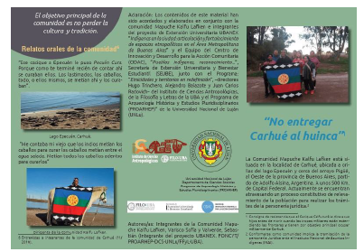 Además, en 2019 se elaboró en conjunto un tríptico: No entregar Carhué al huinca (Comunidad mapuche Kalfulafken, Varisco y Valverde, 2019), el cual contiene temas elegidos por las familias para ser divulgados. Este ha sido distribuido, por la dirigencia, a integrantes de la comunidad, oficinas municipales, la Biblioteca Popular Adolfo Alsina, el Museo Regional Dr. Adolfo Alsina y el Archivo Histórico, dependiente del mismo. También las y los integrantes de Kalfulafken asistieron a diversas instancias de difusión en la zona, como la Radio Local de Carhué. Según la Lonka, el objetivo de repartir el folleto y asistir a medios de comunicación "es para mostrarle a la gente que estamos avanzando y haciendo cosas, que no va a quedar todo en la nada" (conversación informal, julio de 2019). La importancia que se le da al mismo, para demostrar y apoyar el proceso reivindicativo, se puede vincular con lo que sostiene Barrera (2014) sobre la capacidad que tienen los documentos de ser espacios de construcción y validación del saber, así como de subjetividad y poder.