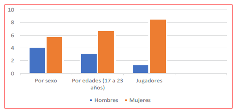 El estudio que se hizo con ocho jóvenes con discapacidad visual arrojó el siguiente resultado. 18 y 23 años, según sexo, edades y jugadores (ver tabla 1).