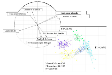 De igual forma, la Tipología 4 (entre 51 y 100 cabezas de ganado) agrupa la mayor cantidad de hombres en la familia y la edad de las mismas, con un aporte al componente principal 2 de 22.5 % (figura 1). También, de acuerdo con el test de Monte-Carlo con un valor de significancia del 0.001 indica que existen diferencias altamente significativas entre las variables evaluadas y cada una de las tipologías de familias analizadas; en este sentido, la educación de la familia es un activo humano muy importante que determina si los hogares pueden participar en actividades con mayor remuneración económica (Zhang et al., 2019).