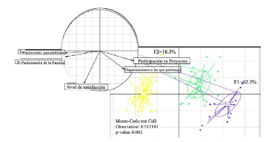 El segundo componente principal (CP2), con un aporte del 18.5 % muestra un buen nivel de satisfacción, el cual no está directamente relacionado con una tipología de familia en particular, pero de acuerdo con los resultados obtenidos, se determina que en general los productores ganaderos del municipio tienen una buena apreciación en esta variable (figura 2). El test de Monte-Carlo con un valor de significancia del 0.002 indica que existen diferencias altamente significativas entre las variables evaluadas y cada una de las tipologías de familias analizadas. La participación en proyectos y en actividades sociales principalmente la realizan las mujeres, las cuales tradicionalmente aportan al cuidado del hogar y generan beneficios económicos a la familia (Arias et al., 2014).