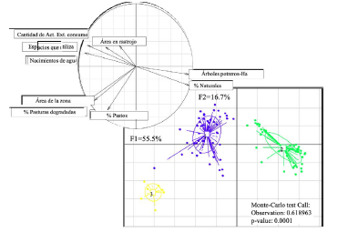 De igual forma, el segundo componente principal (CP2), con un aporte del 16.7 %, agrupa a la Tipología de familia 3 con las variables mayor área de la zona, dado que posee las mayores extensiones de terreno para el uso ganadero, mayor porcentaje de pasturas degradadas y área en pastos, lo cual está directamente relacionado con la cantidad de cabezas de ganado que tienen (figura 3). El test de Monte-Carlo con un valor de significancia del 0.0001 indica que existen diferencias muy significativas entre las variables evaluadas y cada una de las tipologías de familias analizadas. Tal y como se puede ver en el uso del terreno, y a pesar de la gran distribución de vacas, es indiscutible hablar del potencial productivo que tiene el departamento del Caquetá, cuenta con grandes áreas de interés para modelos de producción ganadera, lo que ha hecho evidente el alto grado de deforestación en la región, debido principalmente a la poca distribución de los espacios de uso dentro de las fincas ganaderas en la región (ICA, 2022).