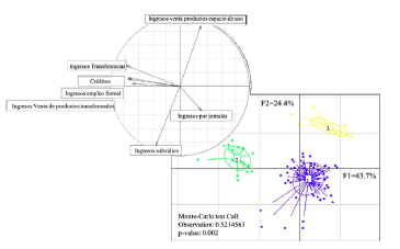 El segundo componente principal (CP2), con un aporte del 24.4 %, agrupa a la Tipología de familia 3, asociada fuertemente con los mayores ingresos provenientes por la venta de productos de espacio de uso; dichas familias, al poseer mayor cantidad de cabezas de ganado, basan gran parte de su economía en dicha actividad, pero la diversifican con otro tipo de ingresos, como cultivos de caucho, cacao, piña, plátano, yuca, entre otros (figura 4). El test de Monte-Carlo con un valor de significancia del 0.002 indica que existen diferencias altamente significativas entre las variables evaluadas y cada una de las tipologías de familias analizadas.
