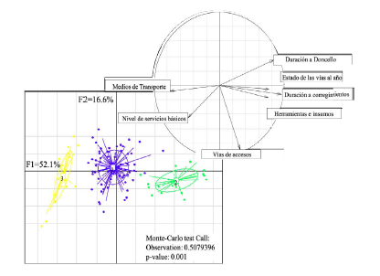 Para este capital se observa un aporte del primer componente (CP1) de 52.1 %, que posiciona a las tipologías 1 y 2 al extremo positivo del mencionado componente con las variables duración a Doncello, estado de las vías al año duración a corregimientos y herramientas e insumos, mientras que al extremo negativo muestra a la Tipología 3, asociada con mayor nivel de servicios básicos en las viviendas y más medios de transporte. El segundo componente principal (CP2), con el 16.6 %, asocia la variable vías de acceso, que son iguales para todas las tipologías de familias (figura 5). El test de Monte-Carlo con un valor de significancia del 0.001 indica que existen diferencias altamente significativas entre las variables evaluadas y cada una de las tipologías de familias analizadas.