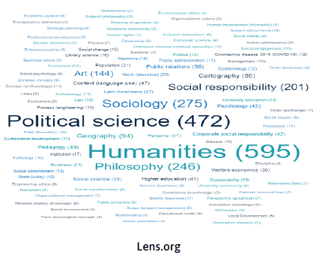 A continuación se muestran los principales campos de estudio de la Responsabilidad Social Universitaria, lo cual se obtuvo al hacer revisión de la página Lens.org sobre la RSU.