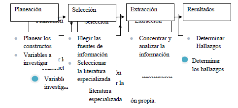 En la tabla 1 se muestran los procesos que se deben seguir para la revisión de la literatura, teniendo como orden en el cuadro uno la planeación, donde en primer lugar se planearon los constructos que se manejan dentro del artículo de revisión. Los constructos tienen dos características: a) se vincula con otros constructos (aspecto relacional),y b) es sujeto de observación y medición (aspecto reductivo), y en segundo lugar se buscaron las variables las cuales pueden ser dependientes e independientes, en segundo orden, se realizó la selección, donde se eligieron las fuentes de información y la selección de la literatura que servirá para la redacción del artículo, en tercer orden está la extracción, donde se concentró y analizó la información y en último orden se muestran los resultados que es donde se determinan los hallazgos. (Abreu, 2012)