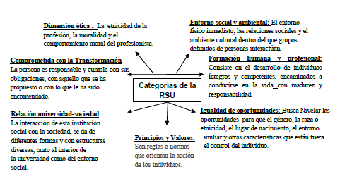 Es por ello que al hacer el estudio de los diferentes conceptos en estos 10 años se lograron identificar las siguientes categorías: a) Dimensión ética, b) entorno social y ambiental, c) formación humana y profesional, d) igualdad de oportunidades, e) principios y valores, f) relación universidad-sociedad, y por último g) comprometida con la transformación.