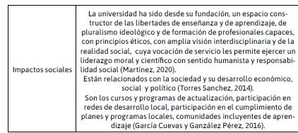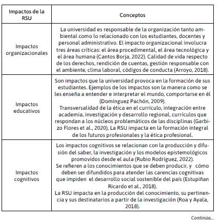 Este planteamiento relaciona a la RSU con la gestión de cuatro impactos, generados en virtud del quehacer universitario: organizacionales: involucran tres áreas críticas: el área procedimental, el área tecnológica y el área humana (Cantos Borja, 2022); Educativos: relacionados con la formación de los estudiantes (su ética, su forma de interpretar el mundo y el rol social que les corresponde); cognitivos: relacionan con la producción y difusión del saber, la investigación y los modelos epistemológicos promovidos desde el aula (Gonzalez et al., 2016), y sociales: los cuales refieren a qué vocación de servicio dentro de la universidades les permite a los estudiantes ejercer un liderazgo moral y científico con sentido humanista y responsabilidad social, dentro del estado de derecho, la democracia participativa y el respeto a los valores humanos (González et al., 2016)