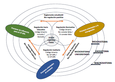 Results: FSU in this context occurs through a trilogy of proximal processes of interinfluence: 1. Influence for the intake of multiple substances, 2. Focused on problematic use, and 3. Transgression of institutional norms, acting as triggers for the experience within and outside the university. These processes, in communication dynamics, shape social systems of bioregulation: socio-educational (indirect self-regulation), health-related (palliative care route), and regulatory (punitive student regulations), attempting to regulate FSU. Regulation is possible through the interaction of proximal and distal risk/protection factors, which can directly and indirectly drive FSU.