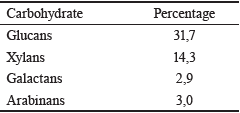 Se determinaron los siguientes indicadores: el contenido de humedad y de ceniza, los extractos en agua y en etanol, la lignina de Klason (como el residuo de la hidrólisis ácida analítica de la biomasa) y los carbohidratos (cromatografía líquida de alta resolución) según las técnicas descritas por la AOAC International (2000). Además se determinó el contenido de proteína cruda por el método Kjeldahl (Gaviria y Bernal, 1995).