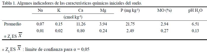 De acuerdo con los análisis químicos iniciales del suelo en la profundidad de 0 a 20 cm (tabla 1) y las tablas de interpretación agroquímica (Cancio, 1982; Paneque y Calaña, 2001), los valores de pH y la concentración de Ca y Mg intercambiable son típicos de estos suelos, y el contenido de K intercambiable es bajo. La concentración de P disponible es alta, y presenta un contenido de materia orgánica medio.