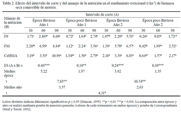 Indicadores del rendimiento de biomasa. Hubo efectos significativos de la interacción entre los factores intervalo de corte y manejo de la nutrición (tabla 2). Los mejores tratamientos en cualquiera de las épocas del año se asociaron con el intervalo de corte de 90 días, y ello obedece a que la morera describe una curva de crecimiento y desarrollo que puede alcanzar, en las edades de 90 a 105 días, el mayor rendimiento de biomasa (Pentón et al., 2007).