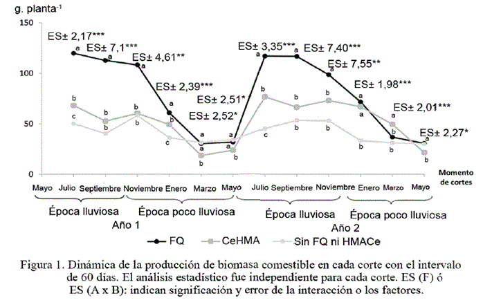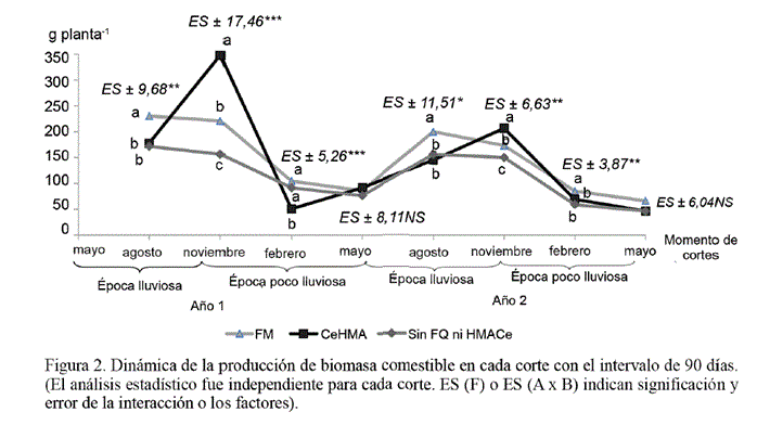 La producción de biomasa comestible por corte en el intervalo más productivo, el de 90 días, mostró diferencias en los tratamientos de fertilización mineral y de canavalia intercalada e inoculada con HMA (fig. 2).