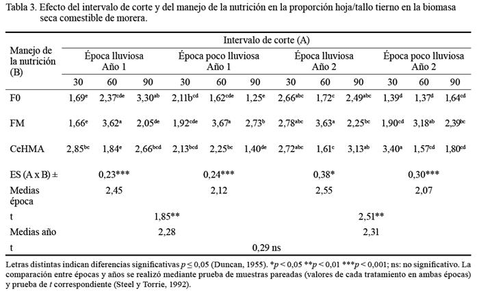 Proporción hojas/tallos tiernos de morera. En todos los tratamientos la proporción hojas/tallos tiernos alcanzó valores superiores a 1,2 (tabla 3), que se corresponden con lo reportado para esta especie. En tal sentido, Iglesias (2003) señaló que el hecho de que en la biomasa comestible de la morera las hojas tengan la mayor proporción hace de esta planta un forraje de calidad superior a los forrajes convencionales.
