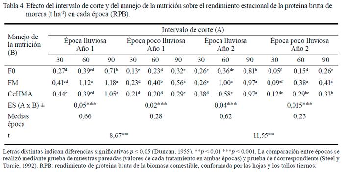 Rendimiento de proteína bruta en la biomasa comestible de morera. El rendimiento de proteína bruta en la época lluviosa fue mayor en los tratamientos con fertilización mineral en los intervalos de corte de 60 y 90 días, y con canavalia intercalada e inoculada con HMA en el intervalo de 90 días (tabla 4). En la época poco lluviosa el mayor valor estuvo asociado al tratamiento de 90 días con fertilización mineral.