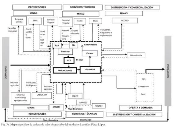 Derivados de estos mapas de cadenas de valor genéricas, se definieron los mapas específicos por producto y para cada productor (64 en total), en los cuales se hizo referencia a las relaciones entre ellos y se precisaron las brechas existentes. En las figuras 3a y 3b se muestran dos ejemplos de estos mapas, donde las líneas continuas representan el flujo material entre actores y las discontinuas el flujo financiero.