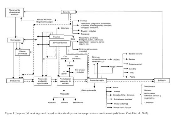 Como último paso de esta primera fase se destaca la elaboración de una propuesta de modelo general de cadena de valor para productos agropecuarios a nivel local (fig 1), el cual tiene en cuenta los nuevos cambios que suceden en el sector agrario cubano, como parte de la implementación de los Lineamientos de la política económica y social del Partido y la Revolución (PCC, 2011) desde el municipio hasta el nivel nacional, entre los que se encuentran: la concepción del desarrollo a partir de los municipios; la descentralización de la economía y la generación de ingresos para su utilización a ese nivel; los programas integrales de desarrollo municipal como herramientas de proyección estratégica a mediano y largo plazo, donde la alimentación a la población es lo fundamental; la prioridad otorgada a los municipios para la sustitución de las importaciones a través del abastecimiento a los polos turísticos; el otorgamiento de las tierras ociosas a productores y cooperativas que cambian la matriz productiva agropecuaria del país; la ampliación del trabajo por cuenta propia; la presencia de nuevas figuras y las nuevas formas de comercialización de los productos; así como la política de beneficios de precios para la compra de productos agropecuarios; lo que fue identificado por Suarez Castella et al. (2014b).