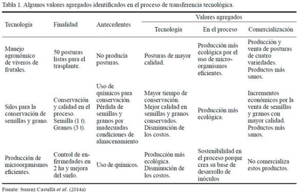 En cuanto a la fase I, se identificaron los valores que se agregan por cada componente de la cadena, los cuales se correspondieron con los que generaron las cuarenta tecnologías transferidas a los productores, conjuntamente con las adecuaciones o acomodos (coinnovaciones) que estos realizaron para garantizar el éxito de su introducción. Un ejemplo de los valores generados por algunas tecnologías introducidas, determinados mediante encuestas a productores, se muestra en la tabla 1; también se precisa que estas agregan valores tanto en los productos como en los procesos (tecnológicos y de comercialización).