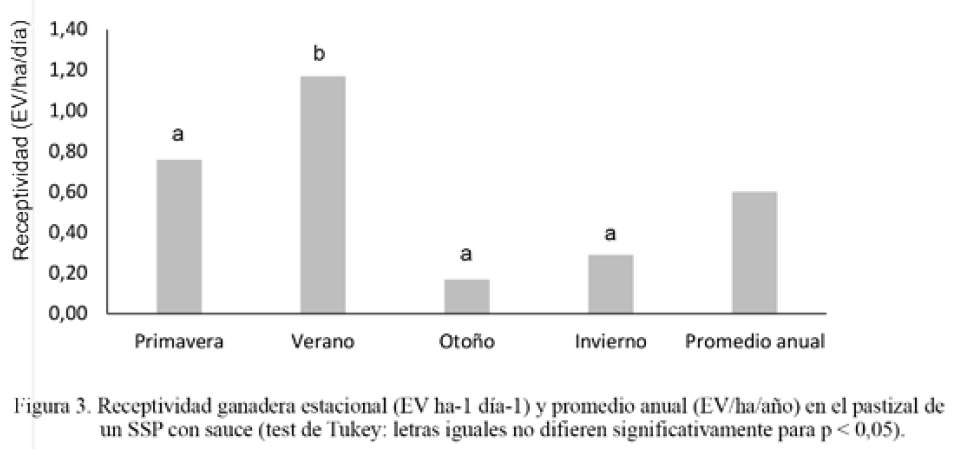El promedio anual fue de 0,6 EV ha-1 día-1. Tal resultado concuerda con los valores de receptividad ganadera reportados por Rossi y González (2014) para el Bajo Delta, en pastizales naturales de SSP con álamos y sauces plantados con baja densidad.