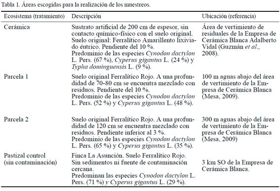 El área de estudio comprendió tres parcelas (tabla 1) que, según estudios anteriores (Mesa, 2009), presentaban contaminación metálica proveniente de la Empresa de Cerámica Blanca Adalberto Vidal, de San José de las Lajas, con 57 años de explotación ininterrumpida. La parcela control (finca La Asunción) se estableció teniendo en cuenta el tipo de suelo de las parcelas contaminadas que tenían relación físico-química con el suelo original y el tipo de pasto presente.