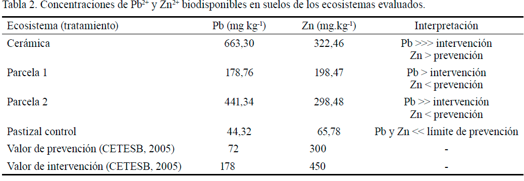 El gradiente de Pb2 se encontró perfectamente definido en los ecosistemas evaluados, ya que se observó un ecosistema control no contaminado (Pastizal); un ecosistema cuyo contenido se considera, según CETESB (2005), superior al límite permisible de intervención (Parcela 1); y dos ecosistemas que lo superaron en 2,4 y 3,7 veces (Parcela 2 y Cerámica, respectivamente).