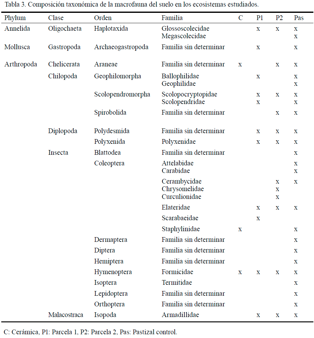En cuanto a la macrofauna, en los muestreos se recolectaron 1 365 ejemplares ubicados en tres Phylum (Arthropoda, Annelida y Mollusca), siete clases (Insecta, Chelicerata, Malacostraca, Diplopoda, Chilopoda, Oligochaeta y Gastropoda), 18 órdenes y 28 familias (tabla 3).