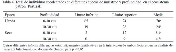 El análisis bifactorial (tabla 4) mostró diferencias altamente significativas en el total de organismos muestreados en el ecosistema control (Pastizal), tanto para la época de muestreo y la profundidad como para la interacción entre ambas. Los mayores valores se hallaron en la época de lluvia en la profundidad de 0-10 cm, por lo que se sugiere que al utilizar la macrofauna como bioindicadora se emplea esta combinación de factores en los muestreos; así se tendrá una mejor representatividad de los diferentes taxones y se arribará a conclusiones más precisas.