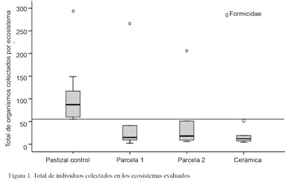Las diferencias entre las medias del total de individuos en los ecosistemas contaminados se evaluaron mediante un análisis de varianza de clasificación simple y posterior dócima de Duncan, para un 95 % de confianza (SPSS 9.0); en este caso se trabajó aparte la familia Formicidae para una mejor visualización de los resultados.