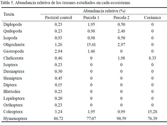 La abundancia relativa es un indicador que muestra de manera porcentual la dominancia de un taxón con respecto al resto de los taxones presentes. Todos los ecosistemas estaban dominados por la familia Formicidae (Hymenoptera), con valores que variaron entre 76,39 % como mínimo (Cerámica) y 90,59 % como máximo (Pastizal control), lo cual coincide con los resultados de los muestreos de ecosistemas pratenses cubanos realizados por Cabrera et al. (2011)