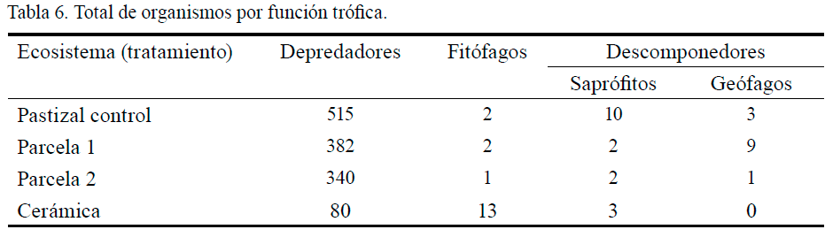 Los organismos colectados correspondieron a los cuatro grupos tróficos relacionados en la tabla 6, según los criterios de Brusca y Brusca (2003). La mayoría se ubicó en el grupo de los depredadores, y representaron el 97,1; 96,7; 98,8 y 83,3% de los individuos colectados en cada ecosistema, respectivamente.