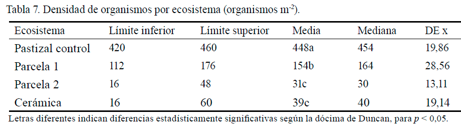 La densidad de organismos mantuvo el siguiente orden: Pastizal > Parcela 1 > Parcela 2 = Cerámica (tabla 7), con diferencias de alrededor de 200 organismos.m-2 entre el ecosistema control y el menos contaminado, lo que representó una disminución del 34,3 %; mientras que con respecto a los otros ecosistemas (Parcela 2 y Cerámica), la densidad disminuyó entre 69,1 y 87,0 %, sin diferencias entre sí, lo que equivale a una disminución de alrededor de 400 organismos m-2. Estos resultados coinciden con los de Feio y Dolédec (2012).
