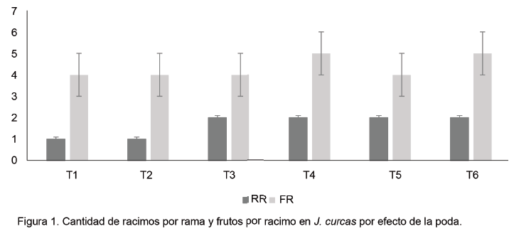 En la figura 1 se muestra el promedio de racimos por rama (RR) y frutos por racimo (FR) que se produjeron en jatrofa. La poda influyó positivamente, en la variable RR ya que no se encontraron diferencias significativas entre los tratamientos con dicha práctica (T3, T4, T5 y T6), pero estos difirieron con respecto a T1 y T2.