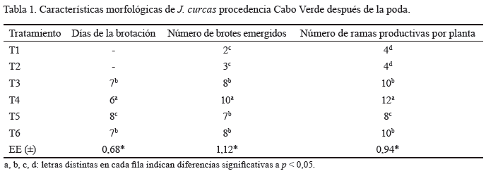 Los resultados de la poda en jatrofa, para las variables días de la brotación, número de brotes emergidos y número de ramas productivas por planta, se muestran en la tabla 1.