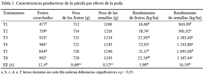 El desarrollo de un mayor número de ramas productivas en T4 resultó un aspecto relevante, ya que según Alfonso y Reyes (2009) este es el principal objetivo que se persigue con las podas en jatrofa, específicamente con la procedencia Cabo Verde. Físicamente, esta procedencia se muestra con un tallo principal del que emergen varias ramas primarias y a su vez secundarias y terciarias (Machado, 2011), por lo que la productividad de la planta estará en función de la cantidad de ramas que se formen a partir de las podas.