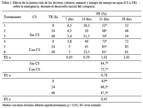 Es importante destacar que los seis tratamientos pregerminativos fueron distintos entre sí a los 21 días de la siembra (tabla 1); sin embargo, cuando se aplicó T1, T2 y T3 con TR de 24 y 48 h para las semillas sin CS se inhibió la emergencia. Similar comportamiento se halló para T4, T5 y T6 con TR de 0 y 48 h. El efecto inhibitorio del remojo se asoció a que a mayor TR el embrión reduce aún más la provisión de oxígeno debido a la condición anaeróbica que se crea por un exceso de agua atrapada entre los cotiledones, lo que pudo haber sofocado el embrión ya que el oxígeno resulta imprescindible en el proceso de respiración de las semillas que ocurre durante la germinación (Hartmann y Kester, 2001; Ramírez et al., 2013). La emergencia del cotoperiz inició a los ocho días después de la siembra, con incrementos en el PE a los 14 y 21 días, y a partir de aquí se hizo constante (tabla 1).