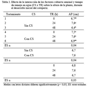 El efecto de la interacción CS x TR en la AP, a los 28 días después de la siembra, se muestra en la tabla 2. Los valores de AP en T1, T2, T4, T5 y T6 no difirieron entre sí, aunque T6 tuvo igual comportamiento que T1 y T3, que mostró la menor altura, atribuida al retraso que el TR de 48 h ocasionó en la emergencia de semillas sin CS.
