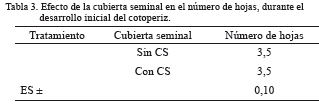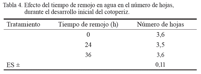Las plantas presentaron un desarrollo homogéneo durante la fase de evaluación, asociado a la calidad de las semillas. El éxito en el trasplante del cotoperiz a bolsa fue alto (100 %). En cuanto al NH, no se encontró interacción de los factores en estudio, ni hubo diferencias significativas de los efectos individuales (CS y TR) en esta variable (tablas 3 y 4); ello indica que la presencia de la CS, el TR y la interacción CS x TR no afectaron la cantidad de hojas en las plantas (tabla 3): tres hojas tanto para semillas sin CS como con CS, y para TR de 24 h (tabla 4); tres hojas para TR de 0 y 48 h. Eso se asoció a que el cotoperiz presentó un crecimiento lento durante el período de evaluación del experimento.