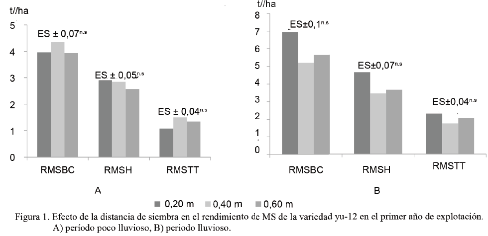 En la figura 1 se muestra el efecto de la distancia de siembra en el rendimiento de materia seca de la biomasa comestible, las hojas y los tallos tiernos, en cada época, para el primer año de explotación del cultivo. No hubo diferencias significativas entre las distancias de siembra para ninguna de las variables estudiadas.