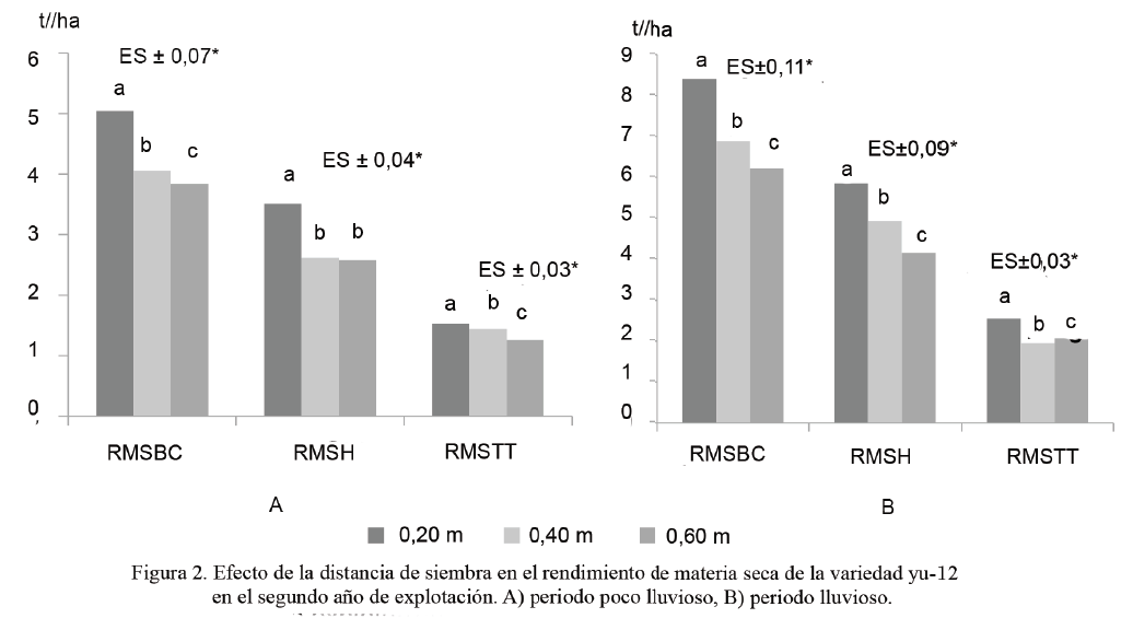 En la medida que se aumentó el espaciamiento entre plantas, disminuyó el rendimiento por hectárea. Con la distancia de 0,40 m los rendimientos fueron intermedios (3,06 t/ha en el PPLL y 5,1 t/ha en el PLL). Cuando se empleó 0,60 m el RMSBC disminuyó, con valores de 2,01 y 3,35 t/ha en cada periodo evaluado.