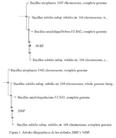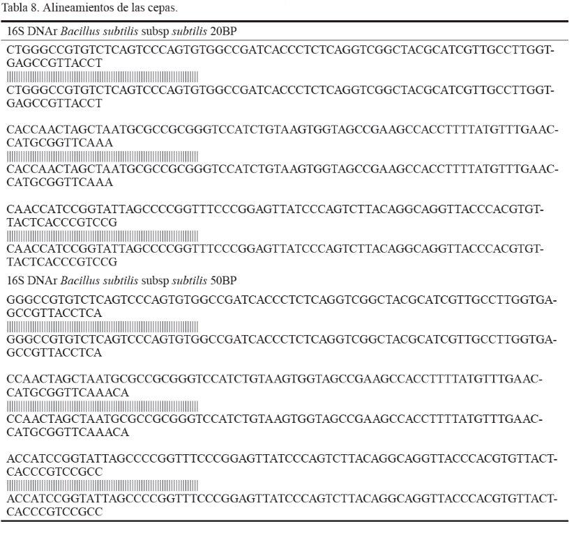 Los alineamientos de la secuencia del segmento de ADNr 16S de ambos aislados con secuencias depositadas en el GenBank se muestran en la tabla 8. La identificación por técnicas moleculares permitió confirmar los resultados de los perfiles de fermentación de carbohidratos. Al mostrar un perfil similar y coincidente con la base de datos internacional de la colección de nucleótidos no redundantes, estos aislados (20BP y 50BP) se reafirmaron como pertenecientes a Bacillus subtilis en un 99 %. Ello confirma la seguridad biológica de los aislados que se identificaron para su posible uso en la elaboración de este tipo de aditivo.