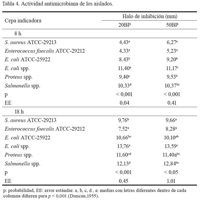 Determinación de la sensibilidad a los antibióticos. La determinación de la sensibilidad de los aislados 20BP y 50BP a los diferentes antibióticos (NEO-SENSITABSTM) se realizó por el método de difusión en discos (Bawer et al., 1966). La sensibilidad se determinó por los halos de inhibición y la prueba se realizó por duplicado.
