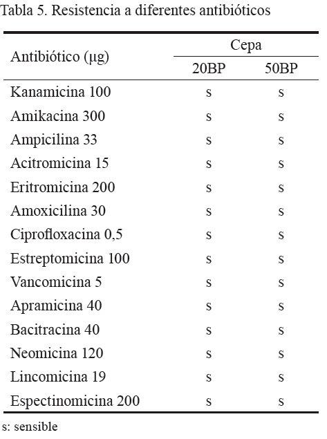Los aislados 20BP y 50BP fueron sensibles a los 14 antibióticos evaluados (tabla 5). Estos resultados son similares a los reportados por Milián (2009), quien evaluó tres cepas de Bacillus con 25 antibióticos y todas fueron sensibles. Ello indica que estas cepas pudieran no presentar plásmidos de resistencia; de ahí la importancia de utilizar pollos de traspatio para el aislamiento de las cepas, ya que estos animales usualmente no son tratados con antibióticos. Existe la creencia de que tanto los cultivos iniciadores para la elaboración de alimentos, como las bacterias que se usan con fines probióticos, sirven como hospederos de genes de resistencia a los antibióticos, los cuales pudieran transferirse a las bacterias patógenas del hombre y los animales (Danielsen y Wind, 2003; Alvarado et al., 2007).